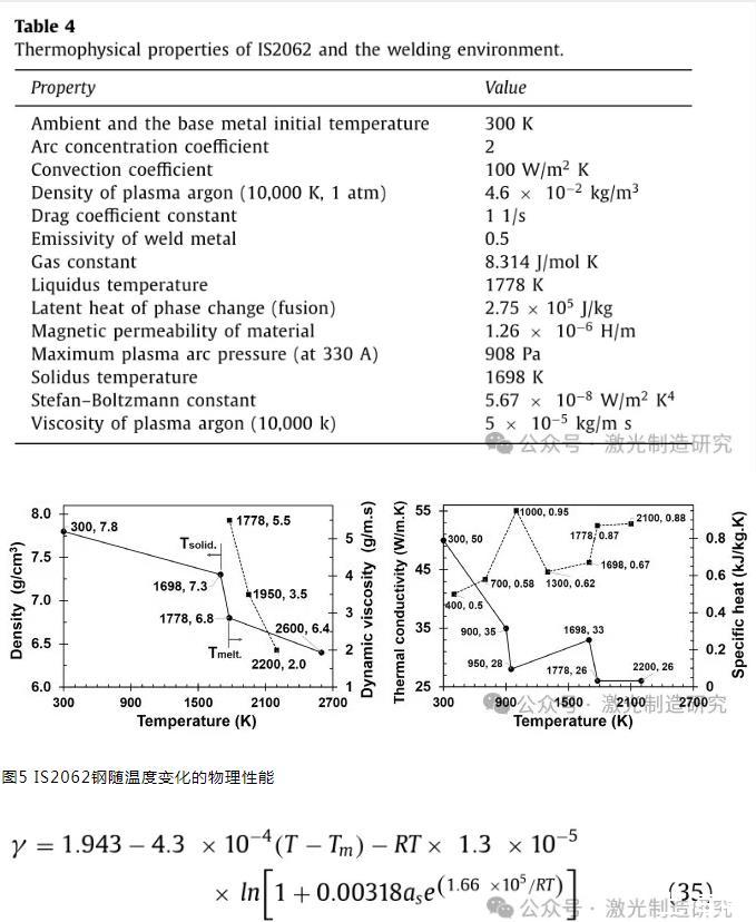 表4顯示了在該模擬中應(yīng)用的IS2062鋼的熱物理性質(zhì)。在溫度相關(guān)條件下考慮了相變和合金元素對不同物理性質(zhì)的影響(圖5)。這些特性是從不同的數(shù)據(jù)庫中收集的,包括FLOW-3D的流體數(shù)據(jù)庫和其他關(guān)于低碳鋼的文獻(xiàn)。自由表面的表面張力被定義為假二元Fe–S系統(tǒng)中溫度和硫含量的函數(shù):