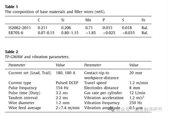 在IIT海得拉巴使用機(jī)器人TP-GMAW設(shè)施進(jìn)行焊接實(shí)驗(yàn),其中兩個(gè)電極分別通過焊槍饋送并從兩個(gè)獨(dú)立的電源接收電力。電源以反相方式同步,以防止后電弧和前電弧之間的相互作用。氬氣82%–二氧化碳18%用作保護(hù)氣體。機(jī)器人焊接設(shè)備由KUKA公司的KR30六軸機(jī)器人組成,該機(jī)器人與Fronius公司的兩個(gè)數(shù)字焊接電源相連。跟蹤電極和引導(dǎo)電極的電流設(shè)置為180 A.通過保持焊槍垂直于工件,在平面位置進(jìn)行長度為200 mm的堆焊。本研究中使用的基材是由鐵素體-珠光體結(jié)構(gòu)組成的熱軋低碳鋼IS 2062-2011。絲狀電極是直徑為1.2毫米的ER 70-S。母材和焊絲的化學(xué)成分列于表1。使用容量為150±0 kgf的Sdyn電動振動機(jī)來產(chǎn)生振動。