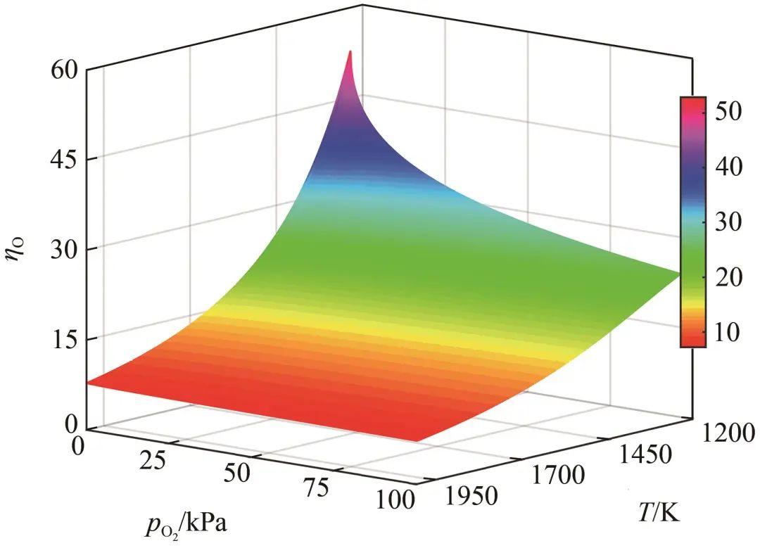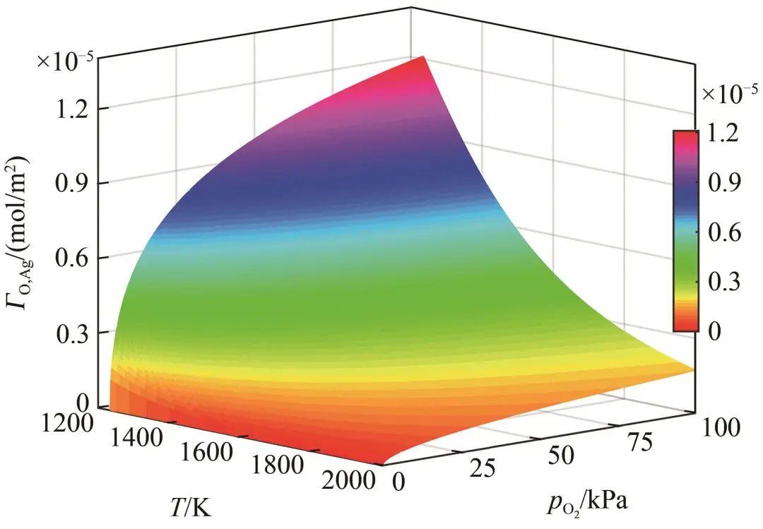 由圖7可知,當(dāng)溫度低于1500 K時(shí),ΓO,Ag隨氧氣壓力升高顯著增加;當(dāng)溫度高于1500 K時(shí),由于液態(tài)Ag-O系中的氧溶解度顯著降低,ΓO,Ag隨氧氣壓力的增加,其增加幅度減小。觀察圖8可知,η隨著溫度和氧分壓的升高而呈現(xiàn)下降趨勢(shì)。這是因?yàn)槭?27)中的表面偏析平衡系數(shù)KII與溫度呈負(fù)相關(guān),當(dāng)溫度升高時(shí)KII減小,導(dǎo)致表面氧濃度降低。此外,在較低的氧分壓條件下,O原子傾向富集于表面;當(dāng)氧分壓升高時(shí),更多的O原子溶入液態(tài)Ag-O系中,引起η減小。