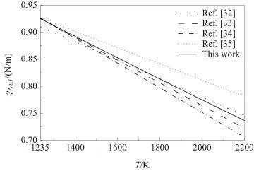 根據(jù)式(7),計(jì)算了液態(tài)Ag的表面張力γAg,T,結(jié)果如圖3所示。總體上,隨著溫度的升高,γAg,T呈現(xiàn)近似線性下降的趨勢(shì)。從圖中可以看出,γAg,T的預(yù)測(cè)值與文獻(xiàn)[32-34]具有較好的一致性,但略低于文獻(xiàn)[35]。