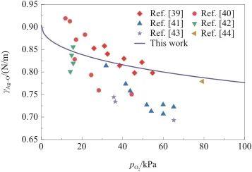 根據(jù)式(33),計(jì)算了1350 K下液態(tài)Ag-O系的表面張力γAg-O,并將計(jì)算結(jié)果與文獻(xiàn)數(shù)據(jù)[39-44]進(jìn)行比較,如圖5所示。觀察圖5可知,γAg-O與氧氣壓力呈負(fù)相關(guān)。在較低的氧氣壓力下,γAg-O的下降幅度比較顯著;而隨著氧氣壓力增加,γAg-O的下降幅度逐漸減小。另外,計(jì)算結(jié)果與文獻(xiàn)[39,40,44]吻合良好,但高于文獻(xiàn)[41-43]。這種差異是可以接受的,因?yàn)樗捎媚P蛢H考慮了溫度和氧氣壓力,而在實(shí)驗(yàn)過程中,系統(tǒng)的表面張力不可避免地受到雜質(zhì)的影響。