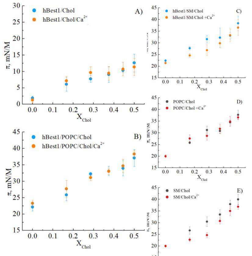 單分子層膜中膽固醇的濃度會影響膜蛋白的許多物理化學、生化和生物物理特性。對于Na+K+ATPase——Chol濃度顯示出調節作用——在膜中低至中等水平的膽固醇(膽固醇:磷脂的比例從1:4到1:2)時,活性增加,而在較高水平膽固醇濃度(膽固醇:磷脂比,1:1)酶活性降低。視紫紅質的功能還取決于膽固醇的存在。高濃度的膽固醇導致層增厚和視紫紅質無法改變其構象,這是其功能所必需的。研究結果證明了膽固醇對hBest1和復合hBest1薄膜的凝聚作用。在POPC/Chol/hBest1和SM/Chol/hBest1三元單分子層中,冷凝效應發生在不同膽固醇濃度下。這也表明Ca 2+離子在膽固醇凝聚效應中起關鍵作用——對于hBest1/Chol和hBest1/SM/Chol單分子層非常明顯。