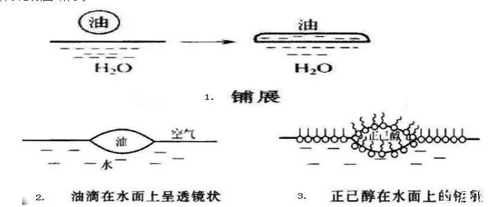 第一種狀態,“油”在水面上,形成一層雙重膜,也就是形成了液體水與膜的界面,和膜與空氣的界面,如此一來,“油”在水面上鋪展形成了兩個獨立界面。