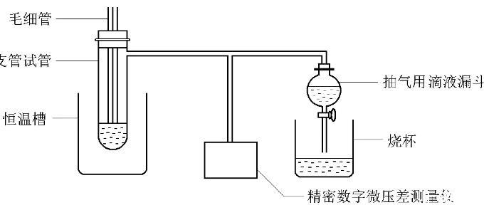 儀器:AF-02型數字式微壓測量儀,數控恒溫槽,5mL和10mL移液管各一支,堿式滴定管1支,50mL容量瓶9個,樣品管1個,毛細管1個,抽氣瓶1個,錐形瓶1個,玻璃漏斗1個。