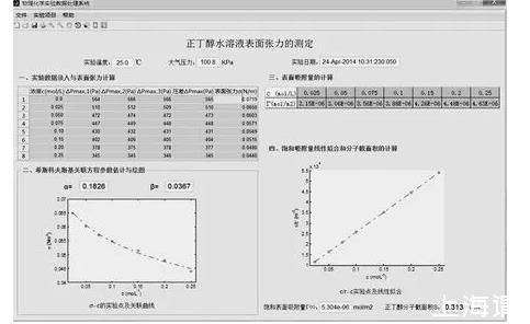借助MATLAB工程計算平臺,通過程序設計完成了“正丁醇水溶液表面張力的測定”應用軟件的開發。在完成錄入壓差實驗數據后,不僅可以自動計算和填入溶液的表面張力,還能夠實現溶液表面張力與濃度定量關系的希斯科夫斯基經驗方程(Szyszkowski′s equation)中待估參數的求解,并用以求導供給吉布斯公式計算溶液的吸附量,進而推算溶液飽和吸附量和正丁醇分子的截面積。軟件的操作過程簡便、直觀、高效,避免了人工數據處理、繪圖的煩瑣和人為誤差,可提高實驗結果的準確性和重現性。
