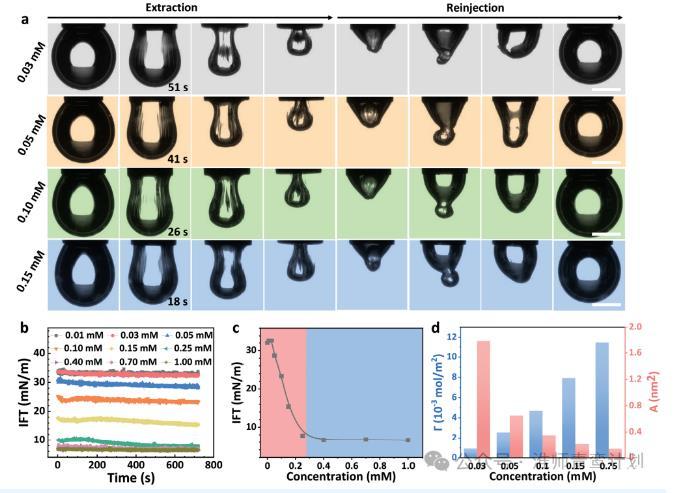 首先,在GL和SSD共組裝之前,用垂滴張力法研究了GL在水-甲苯中的界面行為。如圖1a所示,當(dāng)提取濃度為0.03、0.05、0.10和0.15 mM的甲苯中GL水溶液的液滴時(shí),分別在51、41、26和18 s時(shí),液滴界面面積減小,在液滴界面上出現(xiàn)了明顯的起皺。同樣,當(dāng)液滴完全虹吸到針管中并重新注入到初始體積時(shí),起皺現(xiàn)象重新出現(xiàn),液滴由不規(guī)則逐漸擴(kuò)大到規(guī)則。抽注過(guò)程中起皺現(xiàn)象的出現(xiàn),有力地揭示了水-甲苯界面處彈性膜的形成。圖1b測(cè)量了GL溶液和甲苯之間的時(shí)間分辨界面張力(IFT)。當(dāng)GL濃度<0.03 mM時(shí),甲苯與GL溶液之間的界面張力近似等于純水與甲苯之間的界面張力(≈32 mN·m?1)。隨著GL溶液濃度從0.03增加到0.25 mN·m?1,界面張力下降到6.8 mN·m?1,而從0.25到1.00 mM,界面張力保持在6.8 mN·m?1不變當(dāng)GL濃度<0.03 mM時(shí),甲苯與GL溶液之間的界面張力近似等于純水與甲苯之間的界面張力(≈32 mN·m?1)。隨著GL溶液濃度從0.03增加到0.25 mM,界面張力下降到6.8 mN·m?1,而從0.25到1.00 mM,界面張力保持在6.8 mN·m?1不變。據(jù)此,確定0.25 mM為GL分子在水-甲苯界面處的臨界膠束濃度(CMC)(圖1c)。這意味著液滴在GL的CMC以下會(huì)發(fā)生收縮,而在CMC以上液滴會(huì)發(fā)生起皺。為了進(jìn)一步解釋這一現(xiàn)象,我們計(jì)算了不同濃度下GL分子的界面吸附容量和截面積。圖1d我們可以看到GL的界面吸附量隨濃度的增加成比例增加,相反,隨著濃度的增加,橫截面積減小。綜上所述,GL是一種特殊的兩親分子,可以在油水界面形成界面膜。