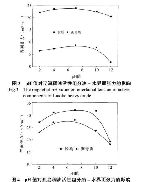 在同一系列組分中,膠質的硫、氧、氮含量低,酸性基團少,但芳香共扼結構也少,酸性基團參與反應的機率相對要高,而瀝青質硫、氧、氮含量高,酸性基團多,但芳香共扼結構多,空間阻滯作用強,酸性基團參與反應的機率相對要低,總體上表現(xiàn)為pH值對瀝青質的油-水界面張力的影響大于對膠質的影響。