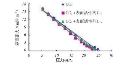 由圖4可知,表面活性劑在一定程度上可以降低原油混相壓力。表面活性劑C14可以降低最小混相壓力接近1MPa,而表面活性劑C18可以降低最小混相壓力接近2MPa,這在理論上可以實現大慶油田二氧化碳混相區的實現,但在降低二氧化碳最小混相壓力方面還需繼續完善和研發新型添加劑。對高溫高壓潤濕性及界面張力儀功能擴展為大慶油田二氧化碳驅油研究提供了有利的基礎保障。