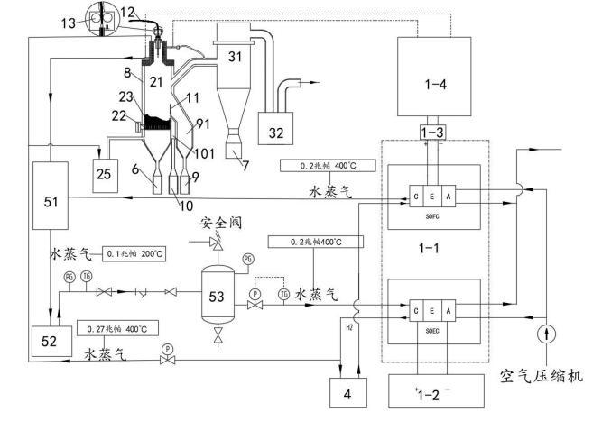 所述供電模塊1中的SOFC燃料電池產(chǎn)生的水蒸氣(0.2Mpa,400℃)進入所述汽水混合加熱器51中,所述等離子噴射模塊2、分離過濾模塊3、粗粉收集罐6、細粉收集罐7與冷卻模塊8換熱后的水(當冷卻介質(zhì)為水時)也進入所述汽水混合加熱器51中,通過所述汽水混合加熱器51的作用將其轉(zhuǎn)化為水蒸氣并傳輸?shù)剿稣羝l(fā)生器52中,所述蒸汽發(fā)生器52將水蒸氣以(0.2Mpa,400℃)的狀態(tài)傳輸?shù)椒€(wěn)壓罐53中,通過穩(wěn)壓罐53穩(wěn)壓并去除水蒸氣中夾雜的水滴后,高溫的水蒸氣進入SOEC電解池中參與電解制氫,并通過儲氫模塊4將制備的氫氣存儲備用。該過程將分離提純過程中供電模塊1中燃料電池燃燒放電產(chǎn)生的高溫水蒸氣與冷卻換熱的熱量加以回收利用,為SOEC電解池提供熱量,避免或減少外部能量的輸入,降低成本。