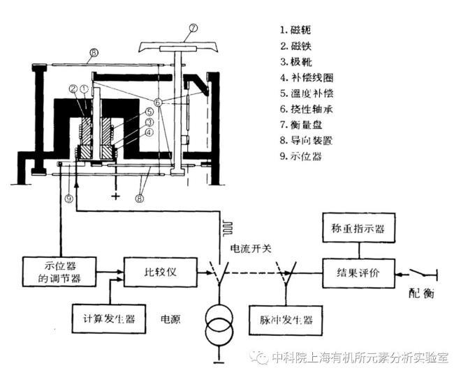 電子天平的結(jié)構(gòu)原理如上圖所示。包括衡量盤(pán)在內(nèi)的載荷接收裝置由兩對(duì)三角形導(dǎo)向裝置控制,衡量盤(pán)只能進(jìn)行垂直運(yùn)動(dòng)。磁鐵裝置由永久磁鐵組成,磁軛和極靴連接在載荷接收裝置的最下端,補(bǔ)償線(xiàn)圈放在磁鐵裝置的空氣間隙中。如果電流流往線(xiàn)圈,線(xiàn)圈中就產(chǎn)生直接向上的力,這種力作用于衡量盤(pán)上的重力。光電掃描裝置使這種力能辨別載荷接收裝置預(yù)先規(guī)定的中心位置。如果載荷有變位,調(diào)節(jié)器及其放大器就改變流經(jīng)線(xiàn)圈的電流,直到回到中心位置為止。在小載荷的情況下,電流通過(guò)時(shí)間短,載荷大時(shí)電流停留的時(shí)間長(zhǎng)。通電流的時(shí)間間隔是通過(guò)平衡位置掃描的可變?cè)鲆娣糯笃鱽?lái)調(diào)節(jié)的,而且這種時(shí)間間隔直接與載荷成正比。這樣,當(dāng)用加載的方式接通電流時(shí),就用計(jì)算器計(jì)算脈沖。當(dāng)測(cè)量結(jié)束時(shí),計(jì)算器指示其結(jié)果。概況來(lái)說(shuō),電磁力平衡式電子分析天平是把待測(cè)物的質(zhì)量通過(guò)電磁力平衡原理變換為電流檢測(cè),再經(jīng)電流/電壓變換、模/數(shù)轉(zhuǎn)換和數(shù)字化運(yùn)算處理,用數(shù)字顯示待測(cè)物的質(zhì)量值。