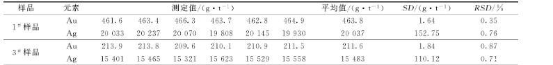 選取兩個粗鉍樣品,1#和3#樣品進(jìn)行實(shí)驗(yàn),稱取2.000 g粗鉍樣品,按照以上實(shí)驗(yàn)方法進(jìn)行實(shí)驗(yàn),每個樣品做了6次平行實(shí)驗(yàn),結(jié)果如表7所示,金相對標(biāo)準(zhǔn)偏差(RSD)為0.35%~0.87%,銀相對標(biāo)準(zhǔn)偏差(RSD)為0.76%~0.71%。