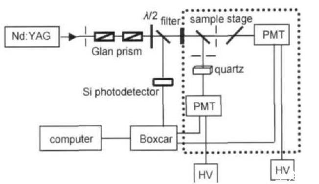 樣品二次諧波產生實驗裝置如圖2所示,光源為美國Continuum公司生產的鎖模Nd:YAG皮秒激光器,激光器輸出的基頻光波長為1064 nm,能量為75 mJ,脈沖寬度為35 ps,重復頻率為10 Hz,經過衰減,照射到樣品上的單脈沖能量為2 mJ左右。激光束經過格蘭棱鏡,再通過一個半波片(用于調節入射光的偏振狀態)后被分光鏡分成兩束,其中反射光用硅光探測器(Si photodetector)采集后傳送到Boxcar門積分器上,用作Boxcar門積分器的觸發信號。而透射光經過濾光片(filter)后進入黑暗的封閉空間(圖中虛線所示,其作用為阻止外部的光線進入,以保證光電倍增管所探測的信號不受外界信號的干擾)后又被分光鏡分成兩束,其中的一束光直接照射到被測量的LB膜樣品上,用于樣品產生二次諧波信號,而另外一束光則照射到標準的Z切型的石英晶體上,測量標準石英樣品的二次諧波信號來監測激光輸出能量的變化。