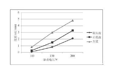 (1)壓電微泵單向閥閉合與張開的有效性對其性能影響很大。方波電壓驅動微泵流速最大,約是正弦波驅動的兩倍,鋸齒波驅動的三倍;壓電微泵在高頻區工作時,閥膜的開關與閉合的頻率亦不能和驅動電壓的頻率匹配,故壓電微泵的效率與驅動頻率之間的關系并不是簡單的線性關系,而是一個復雜的關系。