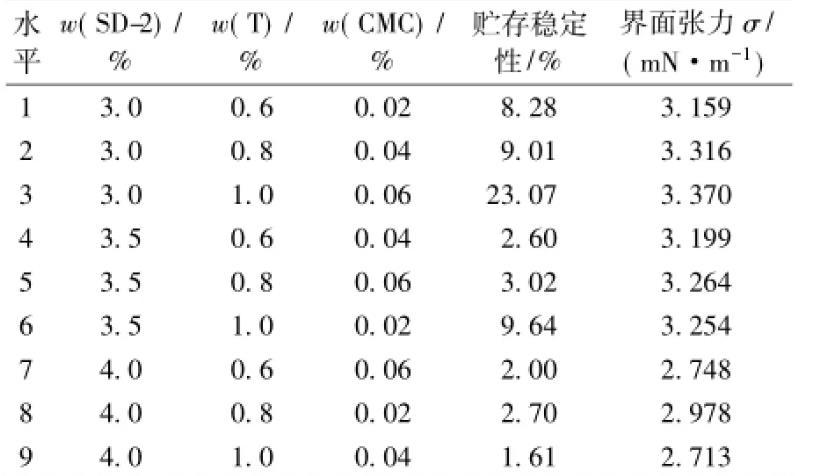 乳化劑SD-2,締合型增稠劑T和羧甲基纖維鈉等是CA砂漿陰離子乳化瀝青中最關鍵的3種組分,對乳化瀝青的性能起著決定性的影響。為了比較對油水界面張力和乳化瀝青貯存穩定性的影響,采用L9(34)正交試驗的方法進行優化設計,因素水平見表1。