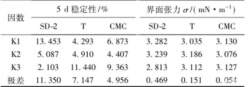 由正交試驗分析結果可知,乳化劑SD-2、締合型增稠劑T和羧甲基纖維素鈉等對油水界面張力和乳化瀝青的貯存穩定性的影響規律一致,兩者仍然能夠呈現出較好的相關性。由極差分析可知,影響界面張力和貯存穩定性的因素由大到小順序為乳化劑SD-2、締合型增稠劑T、羧甲基纖維素鈉。