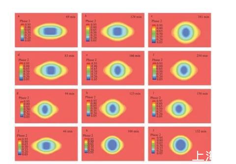 由計算流體力學后處理軟件所得到的液滴形態變化圖,可以看到液滴由最初的圓柱形變化成橢球形,再由橢球形變化成球形。與實驗所得到的各時刻形態圖液滴變化趨勢相同,時間上略有誤差,可能是由于基質導熱速率、加熱臺功率,以及室溫的影響。