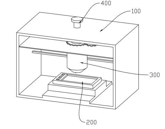 本實施例通過設(shè)置外殼100、涂片臺200和滴液機(jī)構(gòu)300配合,在進(jìn)行滴液操作時,使滴液筒310繞第一方向轉(zhuǎn)動,當(dāng)?shù)我和?10轉(zhuǎn)動時,將促使副筒320和外筒330沿第一方向移動,且此時副筒320移動使滴液腔340體積變小,外筒330移動使第一空腔350體積變大。而滴液腔340體積變小將使滴液腔340內(nèi)的待檢測液從出液口311擠出,由于滴液筒310繞第一方向轉(zhuǎn)動,因此從滴液腔340內(nèi)推出的待檢測液也將轉(zhuǎn)動,進(jìn)而使得當(dāng)待檢測液沿第一方向靠近涂片臺200的一端與涂片臺200接觸時,隨著滴液筒310的持續(xù)轉(zhuǎn)動,將在滴液筒310與待檢測液連接的一端形成一個扭轉(zhuǎn)力,進(jìn)而促使待檢測液滴落,避免液滴因其表面張力的作用不容易斷開,且在進(jìn)行滴液操作時,第一空腔350體積變大后,第一空腔350內(nèi)部將產(chǎn)生負(fù)壓,進(jìn)而使外界氣體能夠從進(jìn)氣口331進(jìn)入第一空腔350內(nèi),而當(dāng)氣體從進(jìn)氣口331經(jīng)過時,隨著滴液筒310的轉(zhuǎn)動,氣流將在出液口311的周向方向上產(chǎn)生一個擠壓力,進(jìn)一步促使液滴與出液口311脫離。