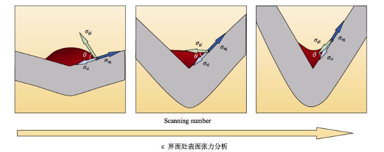 通過對成形過程彎折區域材料的溫度梯度和界面表面張力進行分析可知,激光熱應力成形界面處的表面張力與潤濕角θ的關系可用楊氏方程表示,見式(1)。在成形結束后,界面表面張力的矢量和為零,同時熔凝層表面張力與溫度梯度存在如式(2)所示的關系。