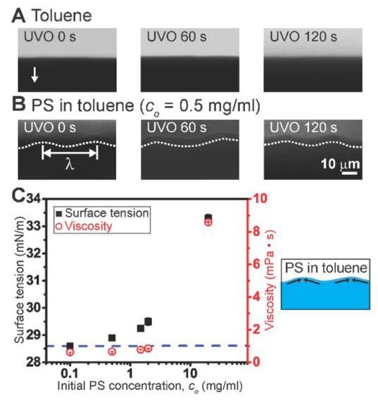 圖 2 (A) 僅通過流涂的甲苯的彎液面前端。 箭頭表示流動后退方向。 (B) 彎月面 聚苯乙烯(PS)在甲苯中通過流涂的前面。 白色的 虛線是眼睛的指南,半月板前面跟隨 k 的周期波長。 (C) 表面張力和粘度作為 初始 PS 濃度的函數。 藍色虛線表示甲苯的表面張力。 示意圖說明 可能由表面張力梯度引起的流動(由 濃度梯度)用于在彎月面蒸發(fā)前沿的甲苯中的 PS。
