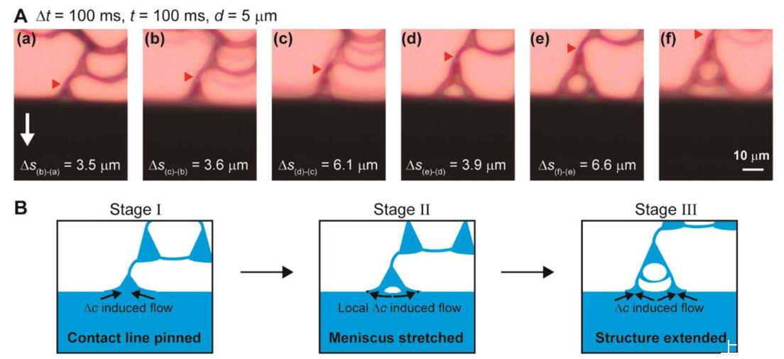 揭示自發(fā)結構形成的細節(jié) 超支化結構,我們采用原位顯微鏡[圖。 3(A)]。 視頻圖像顯示超分支 結構通常分三個階段形成[圖。 3(B)]。 我們注意到,由于我們的彎液面的動態(tài) 過程中,我們很難測量波長 動態(tài)彎液面。 在第一階段,手指平行于 由于馬蘭戈尼不穩(wěn)定性而出現(xiàn)流動方向 和摩擦。 重要的是,三角形半月板將手指連接到半月板前部。 由于手指是 與本體溶液相比,PS 的濃度更高, 手指的表面張力相對較高,拉入 本體溶液,具有較低的表面張力。 這一步是 如圖3(B)(a)所示。