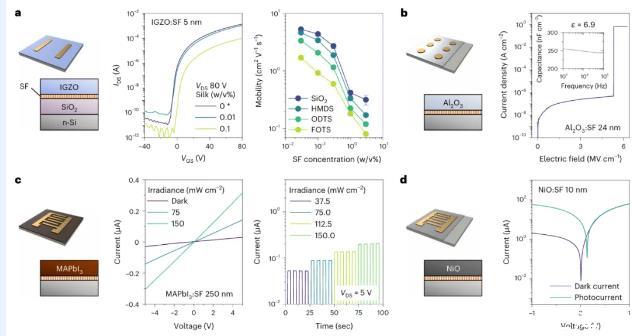 圖4使用絲表面活性劑的水激活納米器件?;贗GZO:SF的場效應晶體管(FET)。中間:用不同的晶體管的轉移曲線。右圖:不同SF晶體管的電荷遷移率。數據點和誤差條顯示平均值±s.d.(樣本數為3)。以及制備的MAPbI3的薄膜的I-V特性。d,基于NiO:SF的光電探測器的結構(左)和在不同側向電壓(中)和時間(右)下的光探測器的結構(左)及其在白光照明下的I-V特性(右)。(右圖)。所有器件都是在疏水性基底上制造的SF基絕緣體的結構(左)及其電流密度-電場曲線。