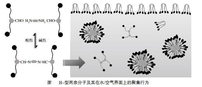 另外一類是含有活性可斷裂鍵的表面活性劑,其中亞胺鍵是一類比較典型的動態(tài)共價鍵。許多新穎的基于亞胺鍵構(gòu)筑的H-型兩親分子,其中亞胺鍵用于連接兩個Bola型的兩親分子,H-型兩親分子自組裝可形成膠束,當(dāng)pH從堿性調(diào)至弱酸性時,亞胺鍵發(fā)生水解,從而導(dǎo)致兩親分子的解離以及不同聚集體形態(tài)之間的轉(zhuǎn)變。