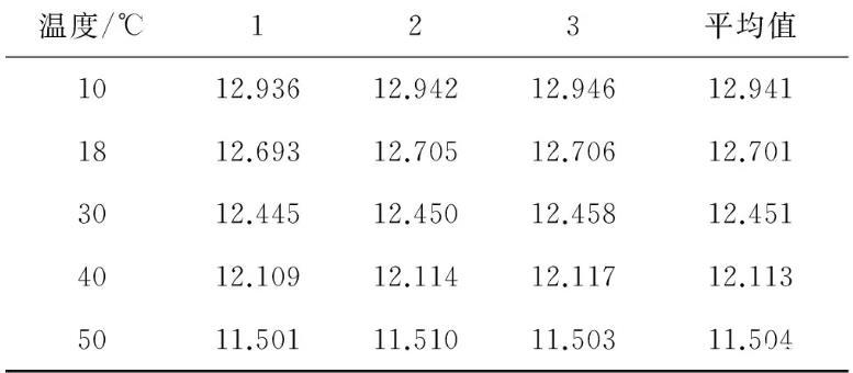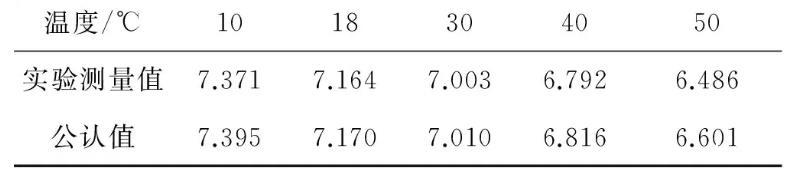 將不等徑U型管內(nèi)徑以及液位差的測(cè)量數(shù)據(jù)代入式(8)中,計(jì)算得到對(duì)應(yīng)溫度下的表面張力系數(shù)的測(cè)量值。查閱已有文獻(xiàn),可以得到不同溫度下純凈水表面張力系數(shù)的公認(rèn)值以及數(shù)據(jù)擬合出的公式α=75.45067-0.13326t-5.26468×10-4t2.實(shí)驗(yàn)測(cè)量值與公認(rèn)值對(duì)比列于表3.