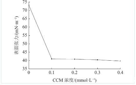 (2)CCM的加入可明顯降低水溶液的表面張力,當(dāng)CCM濃度為0.1 mmol/L時,溶液表面張力為41 mN/m,繼續(xù)增大CCM濃度,溶液表面張力幾乎不變。因此,CCM的臨界膠束濃度約為0.1 mmol/L。
