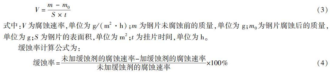 配置不同BQAS濃度(0~250mg/L)的6%鹽酸溶液各200mL。在溶液中掛入處理過的鋼片,密封,并放入60益水浴鍋中。掛片4h后,從酸液中取出鋼片,立即用清水沖洗,去除酸液和疏松的腐蝕產物。