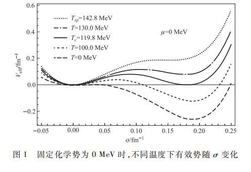 為了更加準(zhǔn)確地描述夸克-膠子等離子體(Quark-Gluon plasma,QGP)與強(qiáng)子物質(zhì)之間的相變特征,在溫度密度有限的情況下,通過(guò)嚴(yán)格的數(shù)值方法,固定化學(xué)勢(shì)為μ=0 MeV,作出如下有效勢(shì)Veff隨σ場(chǎng)變化的函數(shù)關(guān)系圖像。其中,由上至下曲線的溫度依次設(shè)定為T(mén)=142.8,130.0,119.8,100.0以及0 MeV.如圖所示,在溫度相對(duì)較低時(shí),每條勢(shì)能曲線都具有兩個(gè)極小值和一個(gè)極大值,一個(gè)極小值位于σ較小的σ0處,另一個(gè)極小值位于σ較大的σv處,其間存在一個(gè)局域極大值,對(duì)應(yīng)兩極小值之間存在的勢(shì)壘。