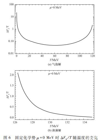 對(duì)于液滴解,ΔFb/T的值在靠近臨界溫度時(shí)也是迅速增加,而當(dāng)溫度遠(yuǎn)離臨界溫度時(shí)逐漸減小。造成這兩者變化的主要不同在于亞穩(wěn)態(tài)是否會(huì)消失,對(duì)于氣泡解從圖1有效勢(shì)的變化可以看出即使到零溫,亞穩(wěn)態(tài)仍然不會(huì)消失,所以ΔFb/T的值會(huì)在接近零溫時(shí)快速變大并趨于發(fā)散,但是從描述相變的角度來看遠(yuǎn)離臨界溫度的氣泡解已經(jīng)不再具有真實(shí)的物理意義。這與以往文獻(xiàn)中對(duì)于此模型研究的數(shù)值結(jié)果是一致的。而對(duì)于液滴解情形有效勢(shì)亞穩(wěn)態(tài)會(huì)在溫度升高到Tsp=142.8 MeV時(shí)消失,Tsp這個(gè)溫度稱為亞穩(wěn)態(tài)分解(Spinodal)溫度,此時(shí)液滴解不再存在,ΔFb/T的值變?yōu)?.