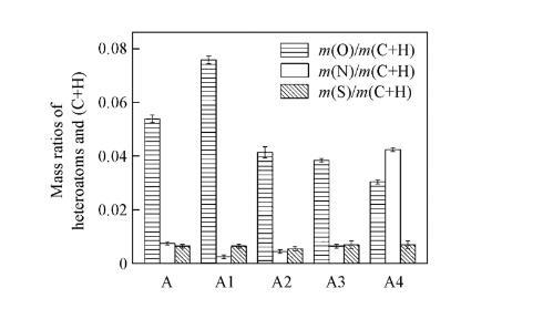表1列出了瀝青質及其亞組分的元素組成分析結果,其中,O的元素組成通過差減法獲得。由表1可知,這些組分主要由C和H元素組成,雜原子(O,N,S)含量較低,與文獻報道的瀝青質元素分析結果一致。雜原子與碳原子和氫原子的質量比m(O)/m(C+H),m(N)/m(C+H)和m(S)/m(C+H)值(見圖2),可以反映瀝青質及其亞組分間雜原子比例的變化。比值越高,瀝青質及其亞組分的極性越高。由圖2可知,在瀝青質及其亞組分之間,m(O)/m(C+H)值變化明顯,其中,A1的m(O)/m(C+H)值最高,A和A2的m(O)/m(C+H)值高于A3和A4的;除A4的m(N)/m(C+H)值明顯較高外,其余m(N)/m(C+H)和m(S)/m(C+H)值變化均較小。由以上分析可知,A1的極性最高,而A3的極性最低。