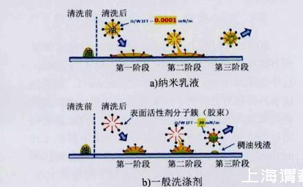 圖1納米乳液和常規(guī)表面活性劑除油機(jī)理對(duì)比