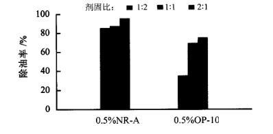 從圖2的脫附除油率來看,當(dāng)納米乳液濃度在0.5%時(shí),除油效果最佳,脫附除油率達(dá)到95.7%;當(dāng)納米乳液濃度達(dá)到5%時(shí),脫附除油下降一半,說明濃度過高的納米乳液反而降低了它的脫附除油效果;在低濃度下(0~1%),納米乳液和含油廢物按劑固比為2∶1處理含油廢物時(shí),脫附效果優(yōu)于劑固比為1∶1的脫附效果。將0.5%的納米乳液NR-A與同濃度下的OP-10進(jìn)行脫附除油對(duì)比,實(shí)驗(yàn)結(jié)果如圖3所示。從圖3的脫附除油率可以看出,當(dāng)劑固比為1∶2時(shí),納米乳液NR-A的脫附除油率(85.49%)是OP-10(34.73%)的2倍多;當(dāng)劑固比達(dá)到2∶1時(shí),納米乳液NR-A的脫附除油率(95.74%)仍比OP-10(74.1%)高出20%。由此說明納米乳液NR-A的脫附除油效果遠(yuǎn)遠(yuǎn)超過常規(guī)表面活性劑。