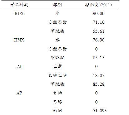 用長24mm、厚15mm的載波片表面及3邊均勻粘取PNIMMO樣品,在室溫下放置72h,待其表面形成光滑薄膜。分別取少量充分干燥后的RDX、HMX、AP和Al粉,采用粉末壓片機直徑13mm的模具壓片。選擇3——5種與待測樣品不互溶,具有一定浸潤效果且極性有差異的溶劑作為參比液。采用OCA200接觸角測量儀測量PNIMMO、RDX、HMX、AP和Al的與不同溶劑的接觸角θ.本文中接觸角θ均為3次平行實驗取平均值。