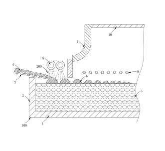 優選的,所述窯外噴射方式為玻璃配合料4經往復式投料機3加入窯爐100的投料池后,料堆6漂浮在熔融的玻璃液5上方,在料堆6被推入窯爐100內前,將消泡劑200均勻噴撒在漂浮的料堆6表面。