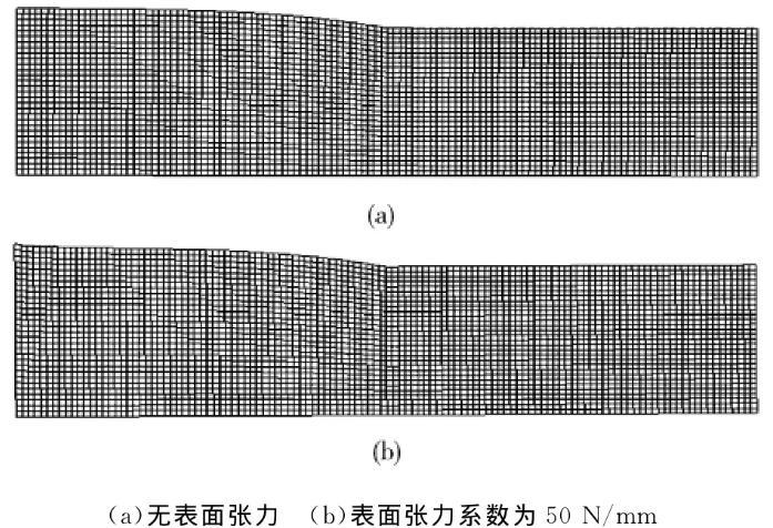 AE=1.2mm時(shí),表面張力系數(shù)為零和表面張力系數(shù)為50N/mm時(shí)的網(wǎng)格變形如圖4所示。從圖4可以看出,有表面張力和沒有表面張力的時(shí)候,網(wǎng)格的變形并沒有太大的區(qū)別,只是網(wǎng)格的變形量略微有些不同。說明有表面張力的時(shí)候,自由表面的形變方式并沒有很大的變化。但在自由表面出口處的變形非常明顯。這說明表面張力對(duì)微擠出自由表面出口處的流場(chǎng)影響很大。這是因?yàn)樽杂杀砻娉隹谔幍倪吔鐥l件突然變化,從而導(dǎo)致表面張力在此處的作用效果有較大變化。