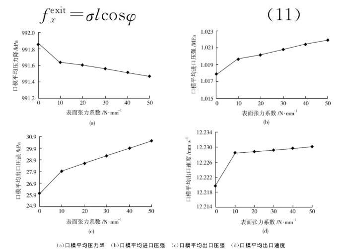 (2)在微擠出中,表面張力系數(shù)越大,擠出脹大越明顯,擠出口模內(nèi)熔體的進(jìn)出口壓強(qiáng)都明顯增大,口模內(nèi)熔體的壓力降略微減小,平均出口速度略微增大,自由表面出口壓力與平均出口速度都明顯減小;