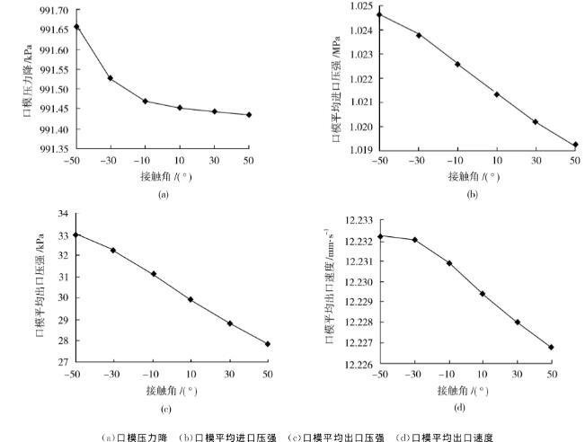 在表面張力系數(shù)為50N/mm不變時(shí),接觸角取值:-50°~50°。得到口模壓力降、口模平均進(jìn)出口壓力、以及口模出口平均速度曲線如圖8所示。由圖8可知,接觸角與口模流場(chǎng)參數(shù)的關(guān)系并不是線性關(guān)系。由圖6可知接觸角θ增大,自由表面擠出脹大比值減小,φ減小,表面張力對(duì)口模出口處的軸向分力如式(9)所示,牽引力隨著夾角φ值的減小而增大,使得材料在口模內(nèi)的剪切能量損失減小,因此壓力降減小。所以圖8(a)中口模平均進(jìn)出口壓力降減小。而圖8(b)、(c)中口模內(nèi)熔體進(jìn)出口壓強(qiáng)的減小是因?yàn)閿D出脹大減小,自由表面對(duì)外做功減小,自由表面對(duì)口模的阻力減小。圖8(d)中口模平均出口速度減小是因?yàn)楸砻鎻埩?duì)自由表面的徑向分力減小,口模內(nèi)熔體出口徑向速度減小,而熔體軸向速度不變,因此平均速度減小。