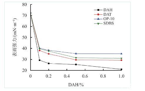 圖3 DAH與常用防水鎖劑對蒸餾水表面張力的影響