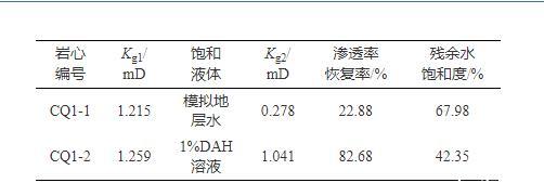 將一塊巖心截為兩塊,測量兩塊巖心干態(tài)下氣測滲透率Kg1,之后將兩塊巖心分別飽和模擬地層水和DAH溶液,使用氮氣在相同壓力下將兩塊巖心驅替至平衡,測量巖心氣測滲透率Kg2及殘余水飽和度,計算氣驅后滲透率與干態(tài)下滲透率比值,即為巖心滲透率恢復率。如表2所示,使用模擬地層水飽和巖心后,滲透率恢復率僅有22.88%,水鎖損害嚴重,而使用1%DAH溶液飽和巖心后,滲透率恢復率高達82.68%,水鎖損害程度大幅降低,殘余水飽和度更低,液相返排也更容易。
