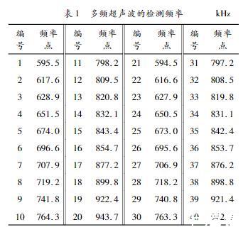 該系統(tǒng)由3部分組成:超聲波傳感器、多頻超聲波控制單元和數(shù)據(jù)處理單元。多頻超聲波控制單元包括產(chǎn)生超聲波信號的超聲波發(fā)射模塊和用于接收超聲波信號的超聲波接收模塊,其中超聲波傳感器的輸入端與超聲波發(fā)射模塊連接,超聲波傳感器的輸出端與超聲波接收模塊連接。與多頻控制單元的信號輸出口相連接的超聲波發(fā)射器將電信號經(jīng)過延遲線中的超聲換能器轉(zhuǎn)換為聲波信號,并進入測量室中的待測介質(zhì)變壓器油中進行傳播。超聲波發(fā)射模塊每20s產(chǎn)生40個頻率范圍為590——1000kHz的超聲波信號,40個頻率點如表1所示。