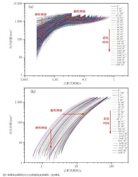 微流變可以通過跟蹤粒子的布朗運動獲得均方位移(mean square displacement,MSD)值測量樣品的黏彈性特性。從圖1中可以看出,隨著樣品老化時間的增加,SAES和AES的MSD曲線都是首先由長位移向短位移轉變,即彈性增加,粒子間碰撞增加;去相關時間由短向長的MSD曲線變化,表明二者的黏度增加。SAES和AES在樣品老化過程中,其結構都發生了變化,黏彈性都有所增加。從圖1中還可以看出,SAES和AES的黏彈性差別較大,在老化過程中SAES黏彈性變化較小,而AES的黏彈性變化較大。