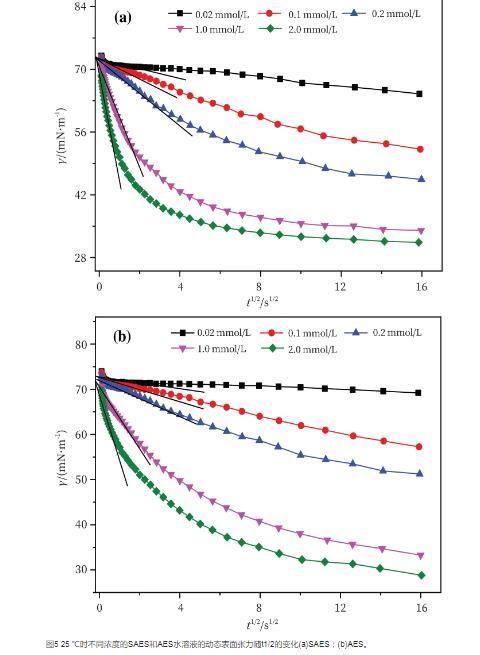 圖4 25℃時不同濃度的SAES和AES水溶液的動態表面張力(a)SAES;(b)AES。