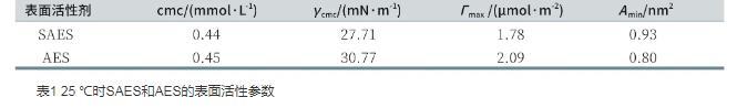 式中n是一個常數,對于1∶1型離子型表面活性劑,其在水溶液中以表面活性離子和反離子的形式存在,根據電中性原則,正離子與負離子的吸附量相等,式中n=2。R為氣體常數8.314 J/(mol·K),T為絕對溫度K,NA為阿伏伽德羅常數6.02×1023,C20為當水的表面張力降低20 mN/m時所需表面活性劑的濃度。由表面張力曲線得到AES和SAES的表面性質相關數據如表1所示。從表1可以看出,AES溶液的cmc和γcmc分別為0.45 mmol/L和30.77 mN/m,該值與文獻報道的AES的cmc(0.33 mmol/L)和γcmc(33~34 mN/m)數值接近。SAES的cmc和γcmc分別為0.42 mmol/L和27.71 mN/m。SAES和AES的cmc值基本一致,這可能是由于二者具有相同的碳原子數,分子之間的疏水相互作用基本相同所致。相比AES,SAES由于支化結構的存在,增加了表面活性劑分子在水表面的覆蓋率,從而使γcmc有所降低。這與一些文獻報道的支鏈型表面活性劑降低表面張力的能力優于直鏈型的結果相一致。支鏈化的結構也使其Amin增大,Гmax減小。