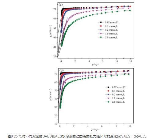 從圖4可以看出所測不同濃度不同表面活性劑的表面張力在初始階段均快速下降,一定時間后趨于平穩狀態。這是因為動態表面張力測試過程中新形成的表面遠偏離于平衡態,吸附層離子的濃度很低,體相與吸附層的濃度差大,因此動態表面張力變化很大。隨著吸附的進行,次表面濃度和表面濃度逐漸增大,擴散和吸附的速度均逐漸降低,動態表面張力隨著吸附時間的增加而降低的趨勢也逐漸變得平緩。當表面活性劑濃度增大時,表面張力的下降幅度和速度也隨之增大,而且相應地縮短了到達平衡狀態的時間。這種隨體系濃度的增加達到平衡所需的時間越短的趨勢與已經報道的一些烷基表面活性劑的結果是相一致的。在相同濃度下,SAES表面張力下降的速率大于AES,這是由于SO4-在碳氫鏈中間的化合物比在端點者擴散速度快。