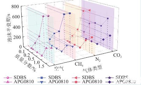 空氣、甲烷及氮氣的穩(wěn)泡性規(guī)律大致相同,注入空氣情況下,SDBS溶液質(zhì)量分?jǐn)?shù)為0.15%時泡沫半衰期約為786.5 s,二氧化碳注入液體的穩(wěn)泡性明顯下降,質(zhì)量分?jǐn)?shù)為0.15%時為584 s,比空氣低202.5 s。推測這是由于二氧化碳為酸性氣體,表面活性溶液在酸性環(huán)境下泡沫穩(wěn)定性不足,泡沫液膜強度不易控制酸性氣體造成的。而APG0810表面活性劑溶液泡沫半衰期在四種氣體注入情況下差異不明顯,是由于APG0810為非離子表面活性劑,在溶液中不是以離子狀態(tài)存在,由此可以推出它的穩(wěn)定性高,不易受強電解質(zhì)影響,也不易受酸、堿影響。
