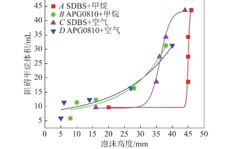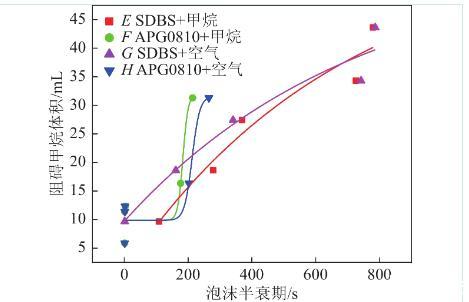 4)泡沫穩(wěn)定性是決定甲烷緩釋效應的關鍵因素,泡沫穩(wěn)定性越強,越能有效控制甲烷流動。可直接采取空氣-表面活性劑泡沫的各項參數(shù)表示泡沫性質。陰離子表面活性劑SDBS表現(xiàn)較好,泡沫穩(wěn)定性較強,隨著時間推移,SDBS也有比APG0810更好控制甲烷釋放的效果。質量分數(shù)為0.15%時,10 min內(nèi)SDBS可以控制約占總通入甲烷體積87%的甲烷。120 min后仍可控制約占通入總體積49.16%的甲烷。