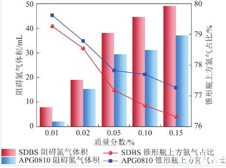 表面活性劑泡沫對氮氣緩釋作用結果如圖11所示。相同質量分數(shù)下,SDBS溶液對氮氣的緩釋效應優(yōu)于APG0810,質量分數(shù)為0.15%時,SDBS和APG0810溶液泡沫阻礙氮氣體積分別為49.102 mL和37.042 mL。