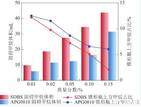 通過式(4)計算得到泡沫中注入氣體含量。圖10中柱狀圖可以看出,SDBS溶液泡沫對甲烷的束縛效果明顯優(yōu)于APG0810,APG0810溶液由于發(fā)泡性及泡沫穩(wěn)定性均弱于SDBS,故對甲烷束縛能力較差。質量分數(shù)為0.05%的SDBS可控制27.43 mL甲烷,0.15%的SDBS可控制43.649 mL甲烷,占總注入甲烷體積87%。質量分數(shù)為0.15%的APG0810溶液可控制31.33 mL甲烷,占總注入甲烷體積62.6%。
